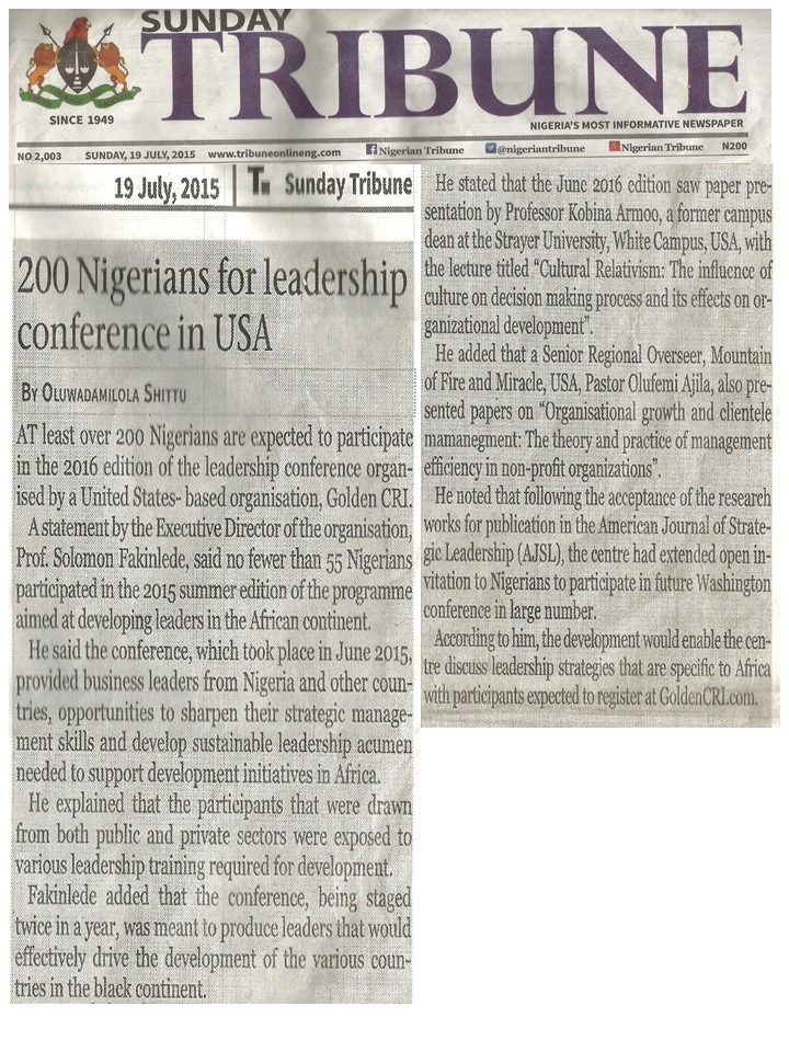 During previous tours of West Africa by the Executive Director of the center, the Nigerian Tribune (July 7, 2011, p.41) credited the center for identifying leadership as the bane of Nigerian economic growth, and at the same time, the Nigerian Compass Newspaper (July 10, 2011, p.7) quoted the center as saying Nigerian leaders lack some rudiments of leadership required during these tough economic times. In separate broadcasts on its ‘Business Today’ program of June 30 and July 6, 2011, the Ondo State Radiovision Corporation (OSRC) called the Washington conference, a must-attend program for business leaders, university professors/staff, and senior government officials.