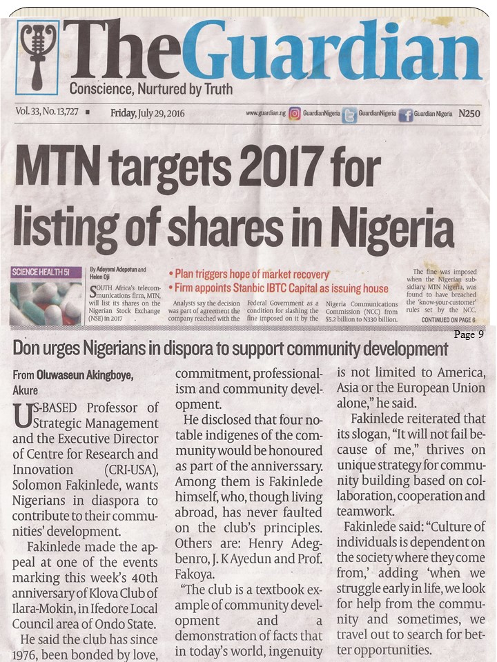 GoldenCRI supports community development initiatives worldwide. Recently, a community development organization in Nigeria, West Africa, the Klova Club, honored Professor Solomon Fakinlede for promoting and supporting community development in the small African town of Ilara-Mokin, the home of Elizade University. In an interview by the Nigerian Guardian newspaper before the ceremony, Professor Fakinlede urged citizens of all countries to give back to their communities. Click here to read full story "Don urges Nigerians to support community development" in the Guardian newspaper of Friday July 29, 2016, p.9.